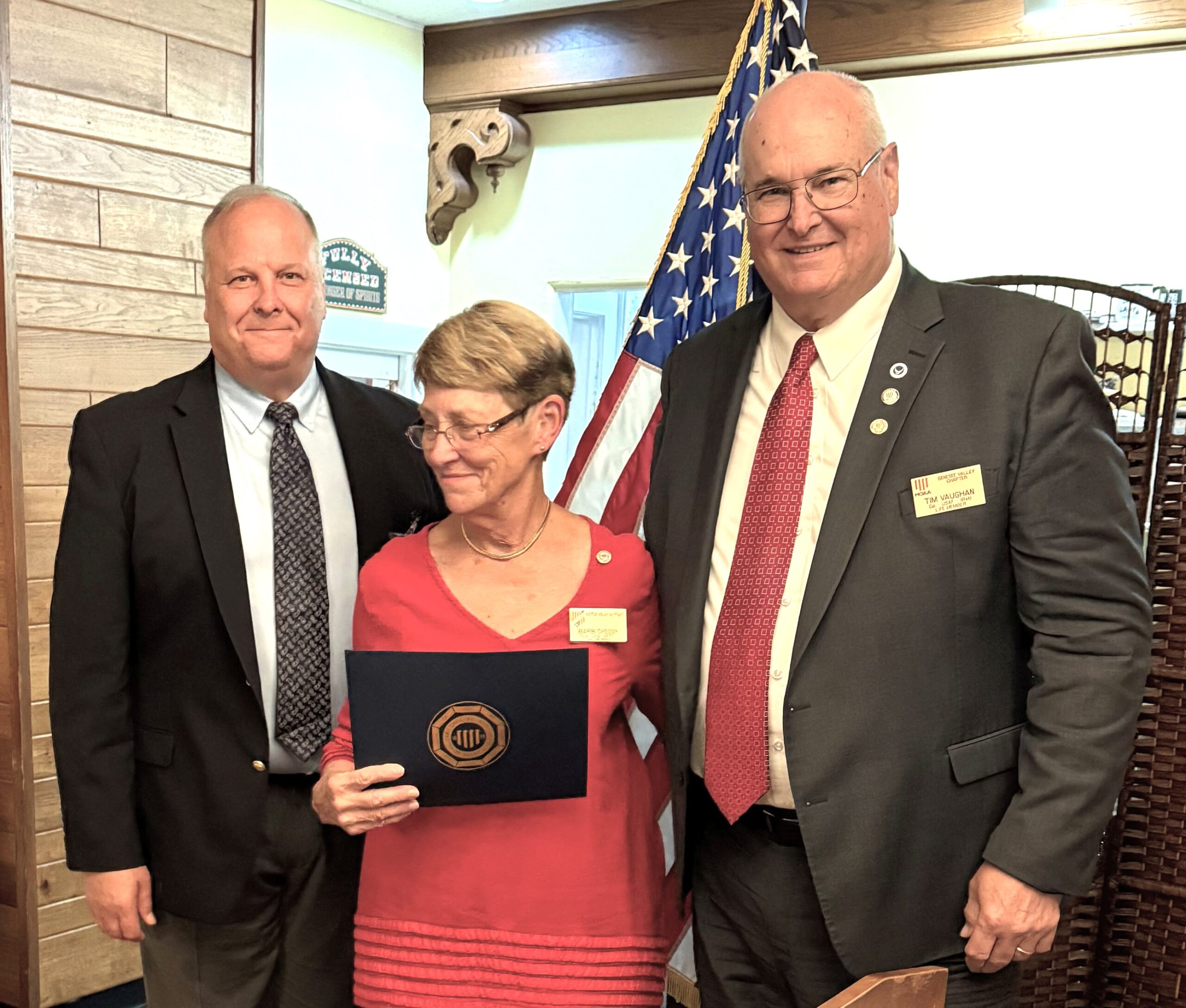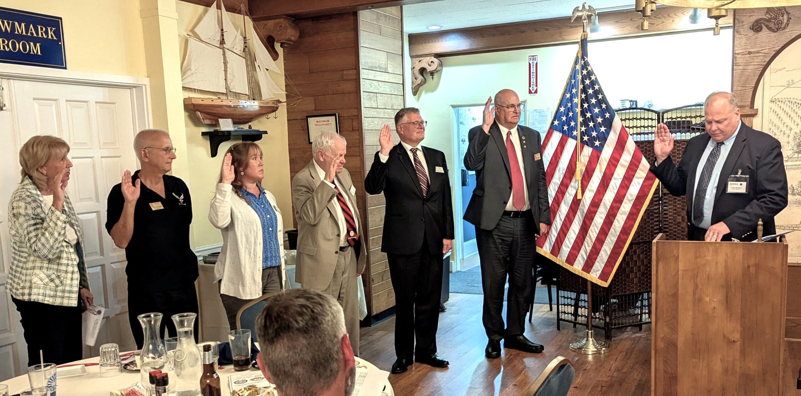 MOAA’s Senior Director, Affiliated Councils and Chapters, CAPT Frank “Tank” Michael, USN (Ret) installs the Genesee Valley Chapter 2025-2027 slate of officers, L-R, Jean Vaughan (Secretary), Paul Cannon (Member-at-Large), Ashley Coldwell (Treasurer), Paul, “Keely” Costello (2nd Vice President), Keith Harris (1st Vice President), and Tim Vaughan (President).