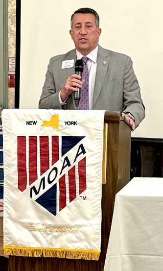 Newly installed New York State Council of Chapters Vice President, and GVC President, Tim Vaughan, accepts three awards on behalf of the Genesee Valley Chapter: the MOAA 5-Star Levels of Excellence Award, the Col. Marvin J. Harris Communications Award for Newsletter and Website by MOAA President and CEO, Lt Gen Brian Kelly, USAF (Ret) at the 2025 New York State Council of Chapters Annual Convention in Saratoga Springs New York.