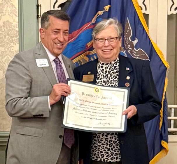 Newly installed New York State Council of Chapters President, and GVC Past President, Norma Weissend, is awarded the MOAA President’s Award by MOAA President and CEO, Lt Gen Brian Kelly, USAF (Ret) at the 2025 New York State Council of Chapters Annual Convention in Saratoga Springs New York.